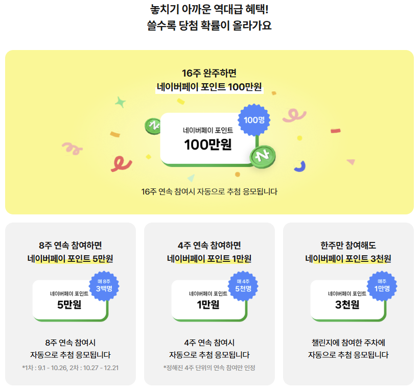 16주 완주하면 추첨해서 100만원 주기도 하고, 1주/4주연속/8주연속 참여할 시에도 추첨으로 3천원~5만원 포인트 줍니다.