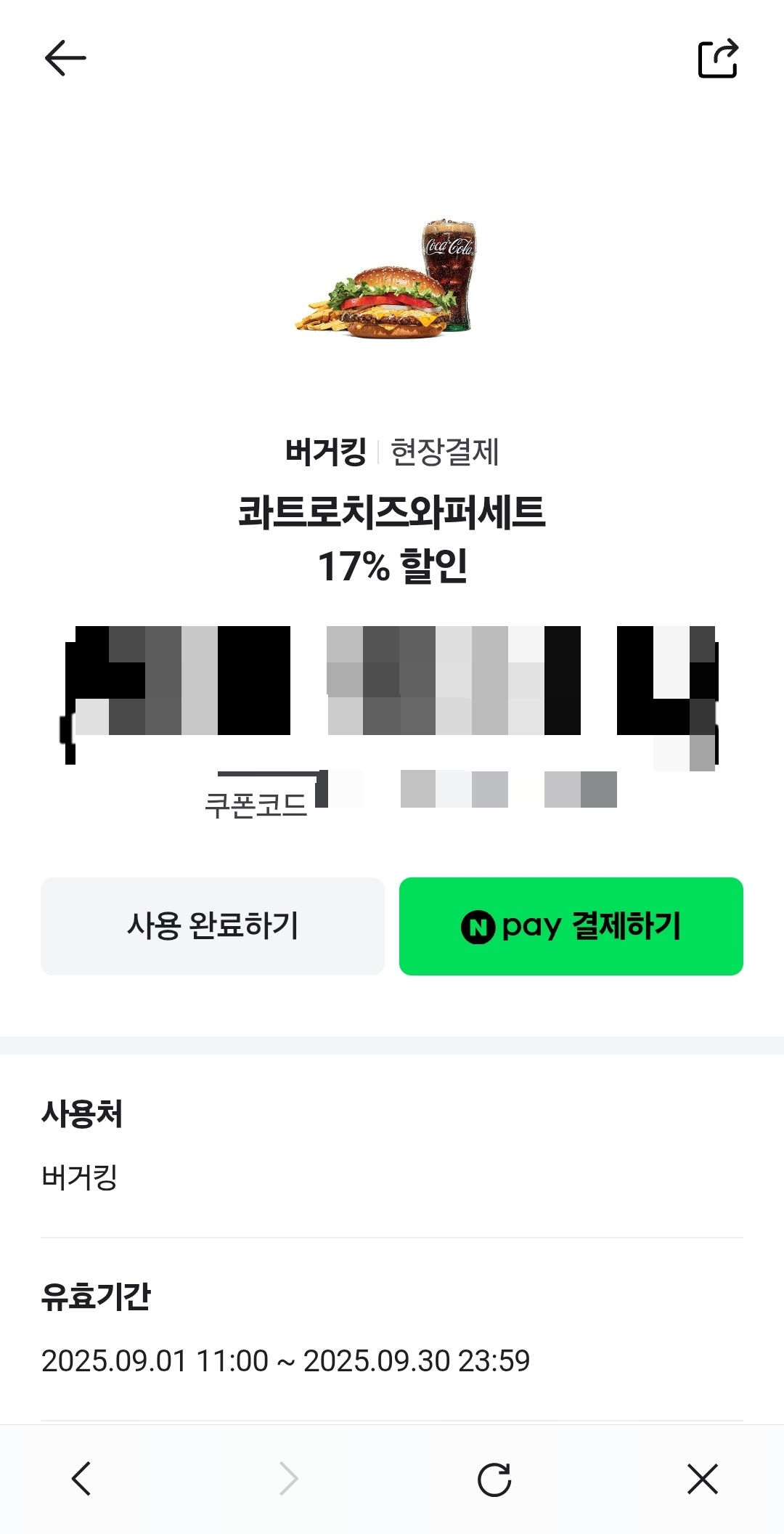 네이버페이 결제 탭 들어가서 쿠폰을 누르고, 현장결제 > 쿠폰 받기 누르면 하단에 푸드에서 '버거킹'을 찾을 수 있습니다.