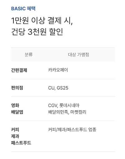 BASIC인 편의점, 배달/영화앱, 카페/패스트푸드 등에서 1만원 이상 결제시 3천원 할인,